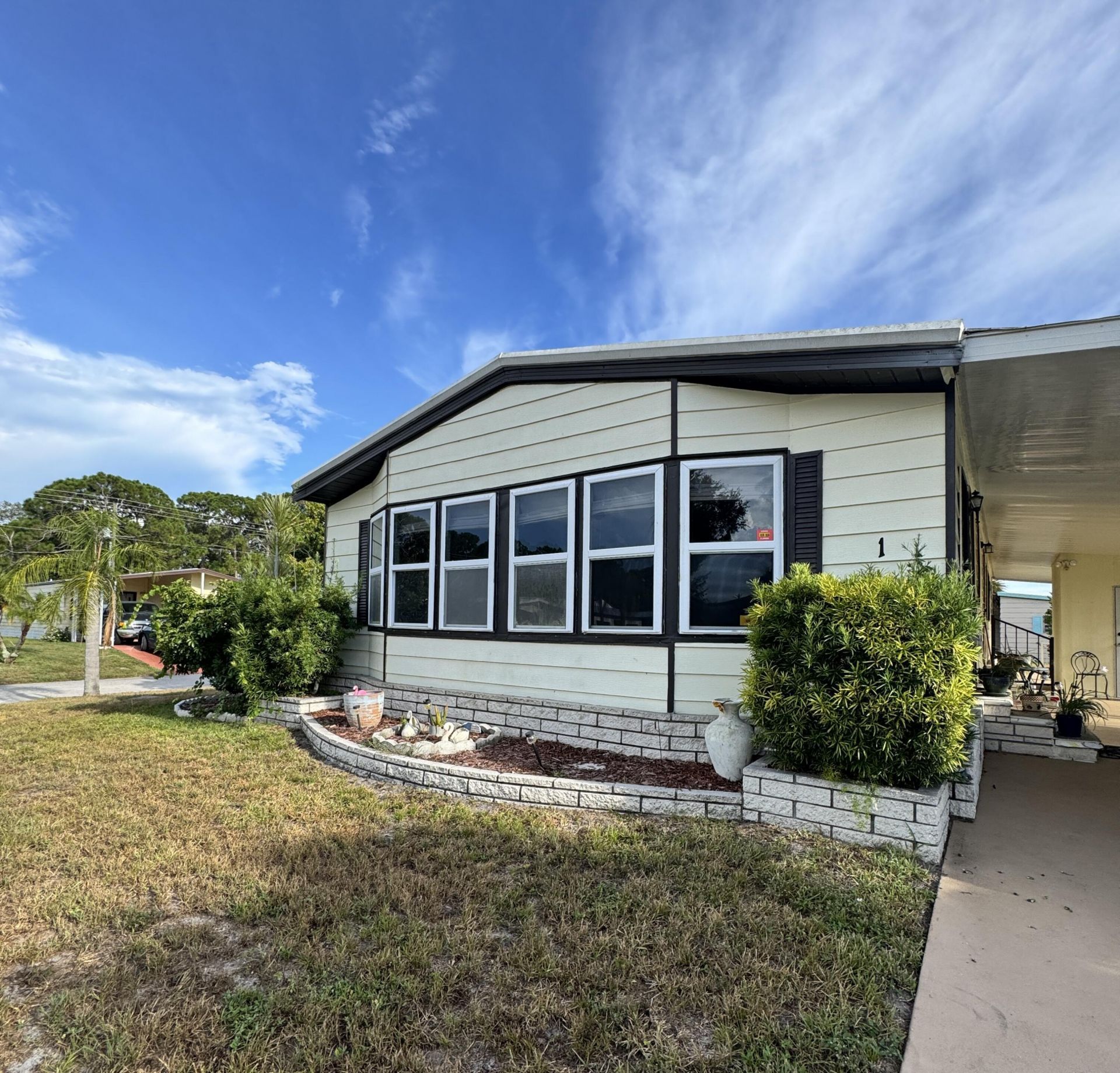 Lovely 2-bedroom 2-bath home in the desirable Spanish Lakes Country Club Village 55 plus community. Home sits on a corner lot on a quiet cal da sac. The house has an open kitchen with an island and bar with extra seating. The dining room has built-in shelves for added storage. The living room has built-in shelves as well. Laundry is inside the home-a large Florida room with ceramic tile and wrap-around windows: laminate flooring, no carpet. Lawn care and trash removal are included in the lot rent. The property features two pools, tennis, pickleball, bocce, and shuffleboard. clubhouse and much more.