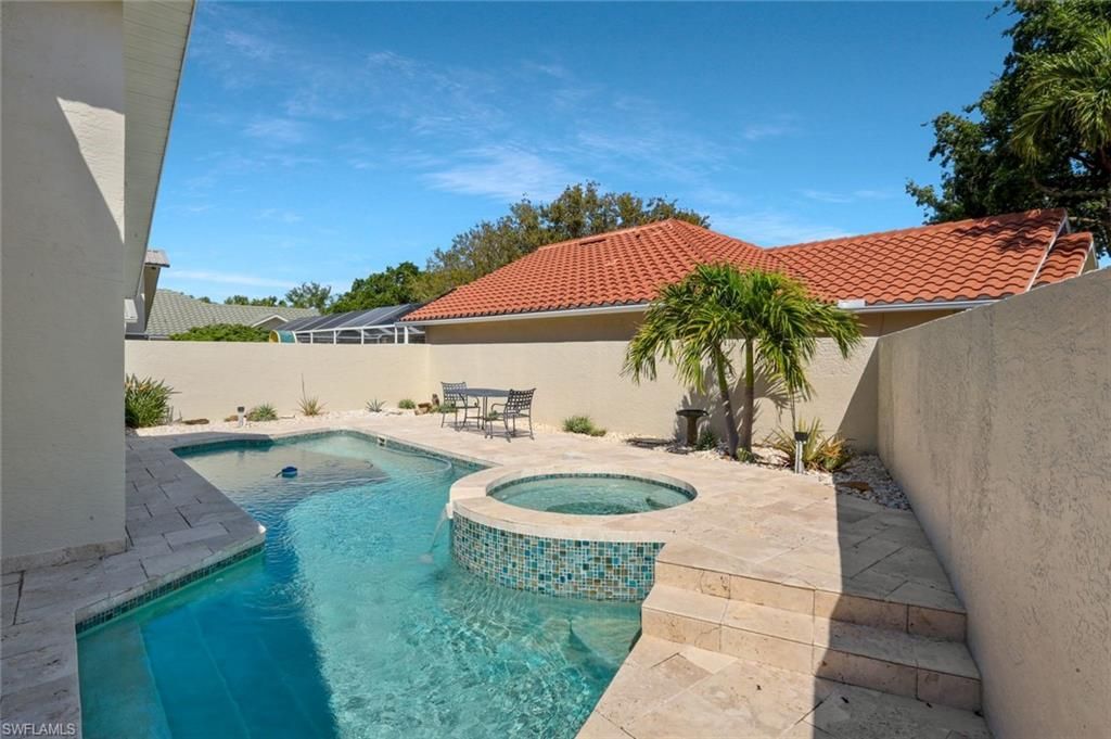 One or more photo(s) has been virtually staged, AI generated or rendered. Nestled in the heart of Naples, this exquisite property offers a serene retreat in the private and secluded gated community of Longshore Lake. A Palm Springs vibe permeates this residence, with all big-ticket renovations thoughtfully completed, NEWER AC, IMPACT WINDOWS & DOORS, NEW GARAGE DOOR ensuring both style and security. The home boasts a freshly painted interior and exterior, with an UPDATED KITCHEN & BATHROOMS featuring stainless steel appliances. Step outside to find a spacious lanai with a pool and spa with travertine decking, complemented by an additional water feature, perfect for relaxation or entertaining guests. Low-maintenance landscaping and a multi-zone irrigation system make it easy to enjoy the lush surroundings and create your own tropical oasis. Residents will appreciate access to community amenities such as a clubhouse with dining, a resort-style pool, a fitness room, and tennis courts, with pickleball courts coming soon. Ideally positioned, this home is just minutes from shopping, dining, and grocery stores, and a short drive to the renowned white sand beaches of Naples, offering the perfect balance of tranquility and convenience.