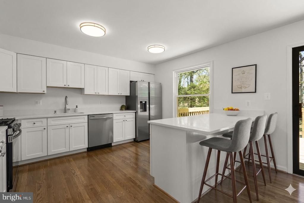 Renovated home with open layout, designer kitchen, new deck, and a flexible 4-bedroom layout. Located in sought-after Tantallon on the Potomac, just minutes from National Harbor and major commuter routes, this move-in ready home combines modern finishes with flexible living and seamless indoor-outdoor flow. This fully renovated 4-bedroom, 2.5-bath home is designed for today’s lifestyle. The main living area is bright and inviting, featuring an open layout that flows seamlessly from the family room to the dining area and into a stunning, all-new kitchen. Quartz countertops, peninsula seating, stainless steel appliances, and soft-close cabinetry create a clean, elevated feel. Just beyond, the new deck extends your living space outdoors—perfect for entertaining or relaxing evenings. The split-level layout offers exceptional versatility. The entry level includes a cozy living room with a wood-burning fireplace, a spacious bedroom ideal for guests or a home office, a powder room, and a finished laundry room with direct access to the flat backyard. Upstairs, the primary suite provides a private retreat with its own en-suite bath, while two additional bedrooms and a full hall bath feature newly refinished hardwood floors throughout. The finished lower level adds valuable bonus space, ideal for a recreation room, media area, or home gym. Located in the established Tantallon on the Potomac community, just minutes from Olde Forte Village, MD-210, National Harbor, and major commuter routes, this home combines comfort, style, and convenience with easy access to Washington, DC. Owner is a licensed Realtor.