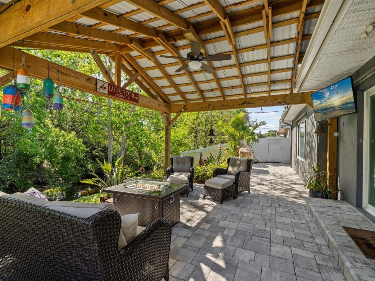 Welcome to this beautifully renovated home in the highly sought-after community of Imperial Park in Clearwater. Showcasing exceptional curb appeal, this residence features a newer tile roof (2021) and an extensive renovation (2022), offering the perfect blend of modern upgrades and timeless charm. Enjoy relaxing evenings on the inviting front porch-ideal for taking in stunning Florida sunsets. Out back, discover your own private tropical oasis with no rear neighbors and a serene freshwater creek, perfect for fishing or kayaking. Best of all, this property is high and dry and not located in a flood zone, allowing you to enjoy waterfront living with peace of mind. The expansive covered patio provides the perfect setting for entertaining or unwinding with a quiet morning coffee while watching the sunrise. Inside, the home welcomes you with a spacious living area, featuring luxury vinyl flooring, crown molding, and an open-concept layout filled with natural light from new windows and plantation shutters. The chef's kitchen is thoughtfully designed with custom cabinetry, granite countertops, high-end stainless steel appliances, and recessed lighting for a warm, inviting ambiance. Just off the kitchen is an oversized indoor laundry room-an ideal convenience during Florida's warmer months. The primary suite offers peaceful backyard views, a generously sized closet, and a beautifully updated en-suite bathroom. Additional upgrades include a newer electrical panel, LED lighting, generator hookup, metal hurricane shutters, a hurricane-rated garage door, newer water heater, and updated ductwork. Imperial Park is a premier Clearwater community known for its walkability, friendly neighbors, A-rated schools and central location. Don't miss this rare opportunity to own a move-in-ready home in one of Clearwater's most desirable neighborhoods!