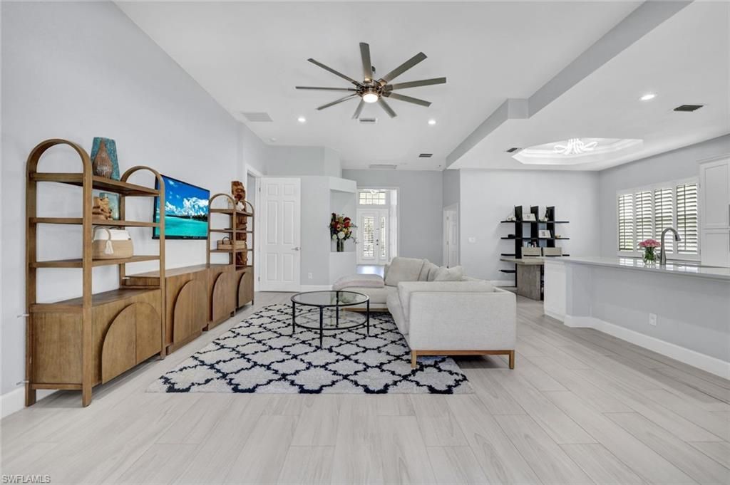 Welcome home to your COMPLETELY RENOVATED North Naples oasis, perfectly situated on a quiet street with serene lake views. Every detail of this stunning residence has been thoughtfully curated—no expense was spared in these breathtaking renovations. The heart of the home is the reimagined chef’s kitchen, featuring a spacious open-concept design, an oversized quartz island, and brand-new high-end appliances, including a wine cooler—perfect for entertaining and everyday living. Elegant custom tile flooring flows seamlessly throughout the entire home, enhancing its modern, cohesive feel. A versatile flex space offers the perfect opportunity for a home office, den, or additional living area. The luxurious primary suite is a true retreat, highlighted by a spa-inspired bathroom with a freestanding soaking tub, dual quartz vanities, and an expansive walk-in shower adorned with custom tile work. Enjoy peace of mind with all major systems updated, including a newer A/C, hot water heater, washer and dryer, along with upgraded high-end lighting and designer fixtures throughout. Ideally located west of I-75, you are just minutes from Naples’ award-winning beaches, premier shopping, fine dining, and Southwest Florida International Airport. Situated within an A-rated school district and zoned for the NEW Aubrey Rogers High School. Located in the desirable Delasol guard-gated community, residents enjoy low HOA fees that include resort-style amenities, as well as Xfinity cable and internet. Delasol is not in a flood zone.