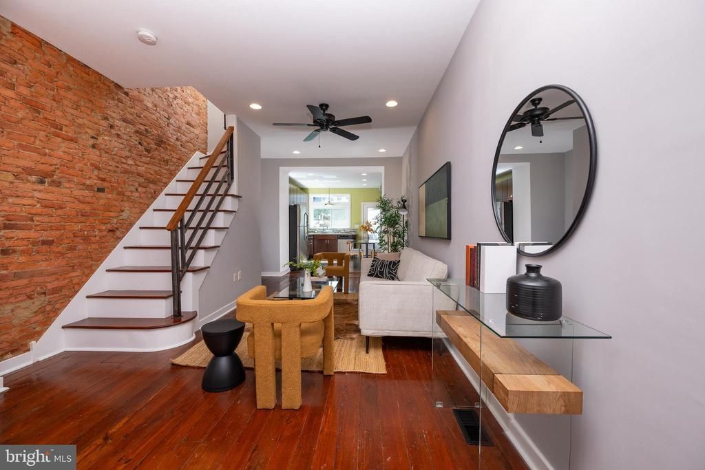 Welcome to this brick-front row home as fresh as its citrus-colored door and cornice. This open concept main level features the same original wide plank flooring featured throughout the house and has a ceiling fan, recessed lighting, a living and dining area, designed for both comfortable living and easy entertaining. Exposed brick is also present here and repeats throughout this home. The kitchen is outfitted with sleek stainless steel appliances, contemporary finishes, and clean, modern fixtures that elevate the space. A large picture window and full view glass storm door fill the space with natural light and provides a lovely view of the private rear patio with custom fence when you're cooking—ideal for BBQs or summer gatherings. Upstairs, the second floor includes two well-sized bedrooms with exposed brick good sized closets, a full hall bath with timeless white subway tile with a recessed shower niche for bath products, a pedestal sink and a tub/shower combination, plus the convenience of a dedicated laundry closet across the hall. The laundry closet is oversized to fit all your supplies. The entire third floor is devoted to a spacious primary suite retreat, complete with an en suite bathroom featuring a walk-in shower. The bedroom has a vaulted ceiling, two separate closets, a ceiling fan and more exposed brick. On this level, there is full view glass storm door access to a private roof deck—perfect for relaxing with your morning coffee or catching some rays! The basement is partially finished with sheetrock, recessed lights and darkly painted joists. Add an area rug and this becomes a great TV room or playroom. Impeccably maintained and owner occupied for the last 13 years: new water heater in 2026, well maintained 2013 HVAC, new upper roof 2018, new deck roofing/cladding in 2025.
