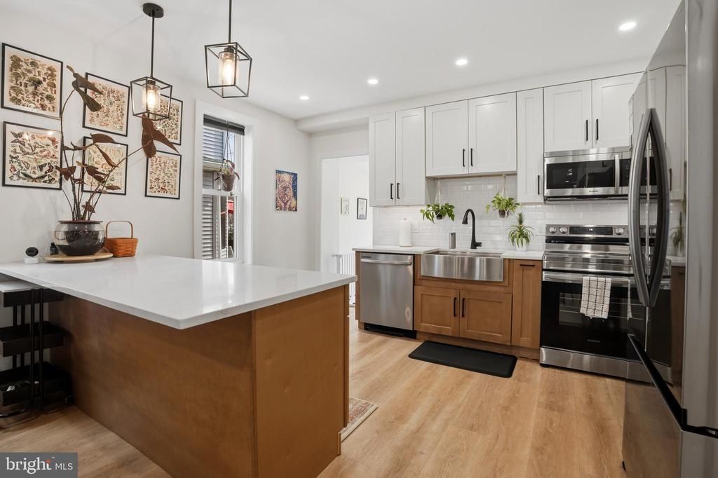 Fully renovated twin in West Conshohocken, rebuilt from the exterior brick in! New insulation, drywall, and systems throughout. A covered front porch leads into a modern, open-concept first floor with warm LVP flooring, recessed lighting, and a brick accent wall. The kitchen features two-toned shaker cabinetry, stainless steel appliances, a farmhouse sink, white tile backsplash, and a large peninsula with statement lighting. Just off the kitchen, a mudroom with built-ins, laundry, and a powder room adds convenience, with direct access to a spacious, maintenance-free deck overlooking a fully fenced yard. The second floor offers two well-sized bedrooms, including a primary suite with a private ensuite bath, plus an additional full hall bathroom. The third floor provides a private retreat with a third bedroom, walk-in closet, exposed brick, and another full bath, ideal for guests or a home office. The finished lower level adds flexible living space with a large rec area (or a 4th bedroom), full bathroom, additional laundry hookups, storage, and walkout access to the backyard. Prime location just minutes from Fayette Street’s restaurants, cafés, and nightlife, with quick access to major routes and SEPTA Regional Rail for an easy commute. Walkable setting with ample street parking, including both resident and nearby public options.
