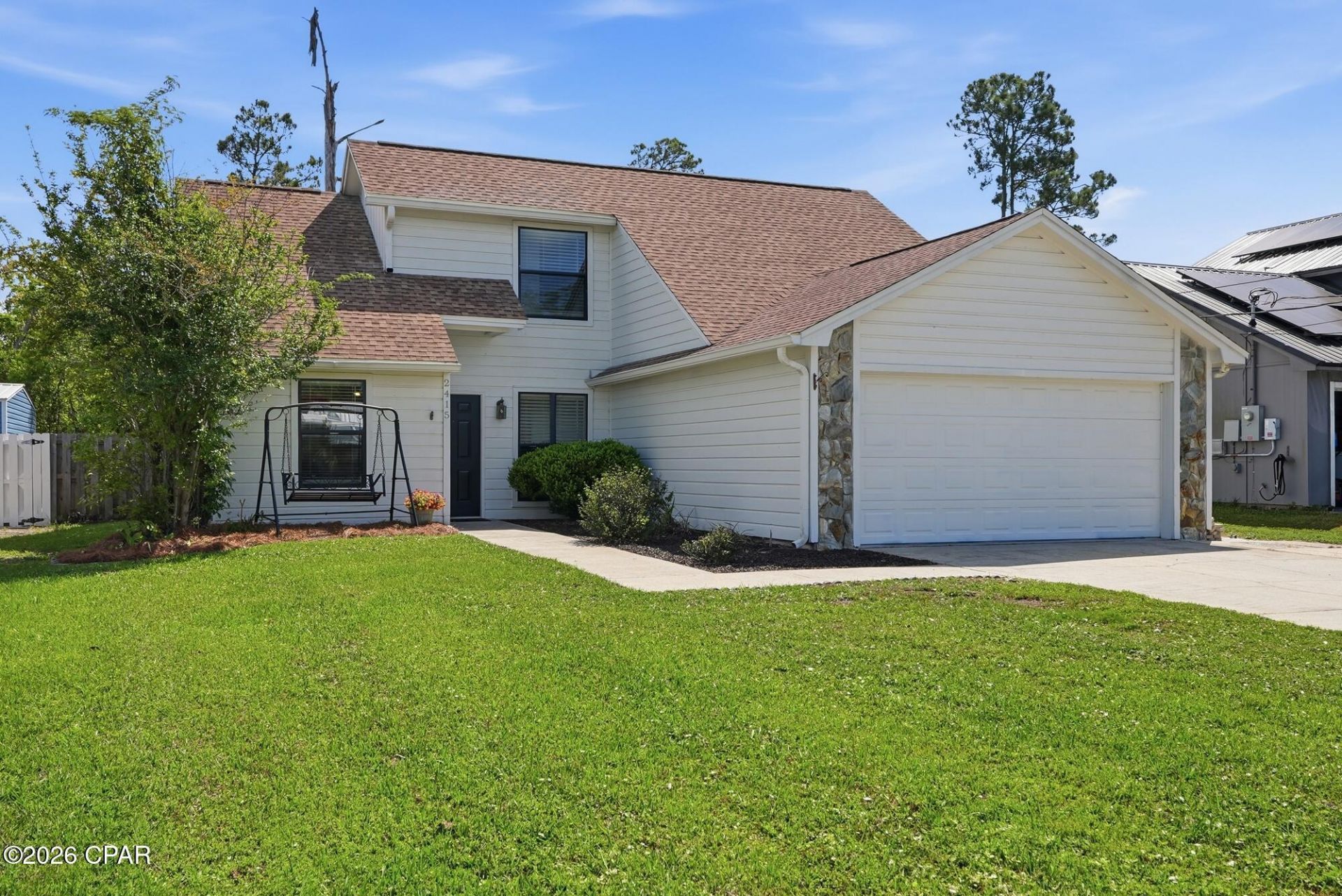 Welcome to this beautifully updated 3-bedroom, 2-bath home in the heart of Lynn Haven, perfectly situated near shopping, schools, and everyday conveniences--including walking distance to Mosley High School. Step inside to an inviting open floor plan featuring stylish vinyl plank flooring, vaulted ceilings, and a stunning stone wood-burning fireplace that serves as the focal point of the living space. The spacious kitchen is designed for both function and entertaining, offering white custom cabinetry, granite countertops, stainless steel appliances, a large pantry, and a breakfast bar that seamlessly connects to the dining and living areas--perfect for gatherings. The first floor includes two generously sized bedrooms with a shared full bath, while the entire second level is dedicated to a private master suite. Upstairs, you'll find a large bedroom, walk-in closet, and an ensuite bath with double vanities and a separate area for the shower/tub combination. This home is loaded with additional features, including a two-car garage, extended driveway, and abundant storage throughout--under the stairs, multiple closets, and attic space. Step outside to your fully privacy-fenced backyard, ideal for relaxing or entertaining. Enjoy the large patio with pergola, hot tub, and fire pit, with plenty of space to add a pool if desired. Located in Flood Zone X and with NO HOA, this home offers both peace of mind and flexibility in a central, sought-after location. Roof 2019 HVAC 2019 Water Heater 2017