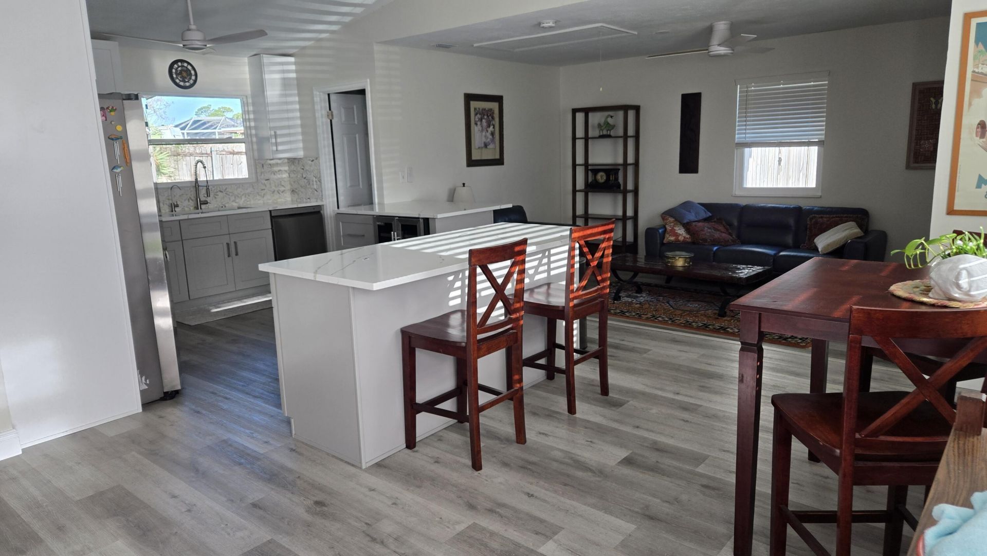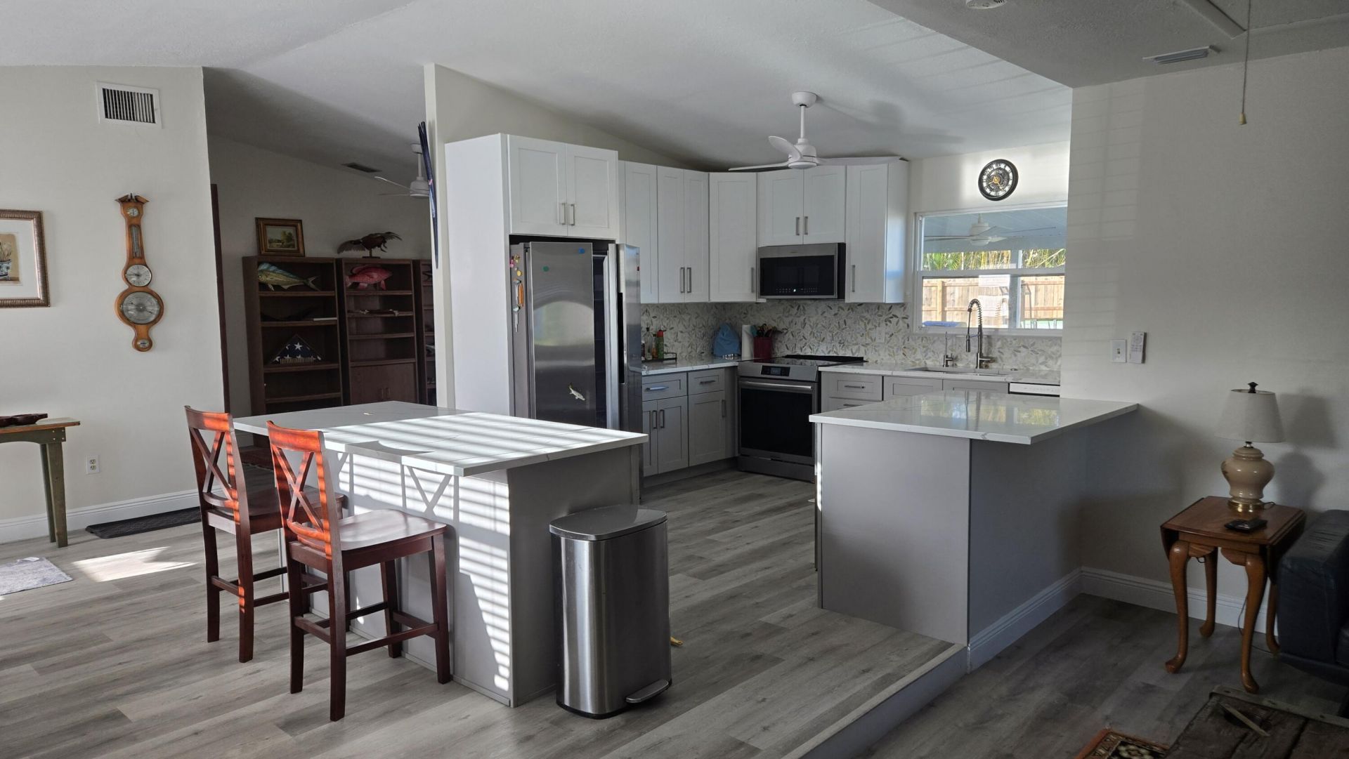 This totally remodeled home is move-in ready whether you intend to occupy, or lease. The home is located in a quiet neighborhood with minimal traffic, and is just minutes away from all major roads, shopping and the beach. A public boat ramp on the C-24 Canal and the Jessica Clinton Park are located within a few minutes of your front door. The oversized corner lot provides easy access and plenty of space for your boat or camper. The covered patio across the entire back of the home is great for entertaining friends and family. Separate laundry / utility room with washer and drier is a plus. Metal roof, new flooring, A/C, water heater and appliances provide peace of mind against unexpected future repair costs. Enjoy cooking in the bright and open kitchen with island bar and wine cooler.