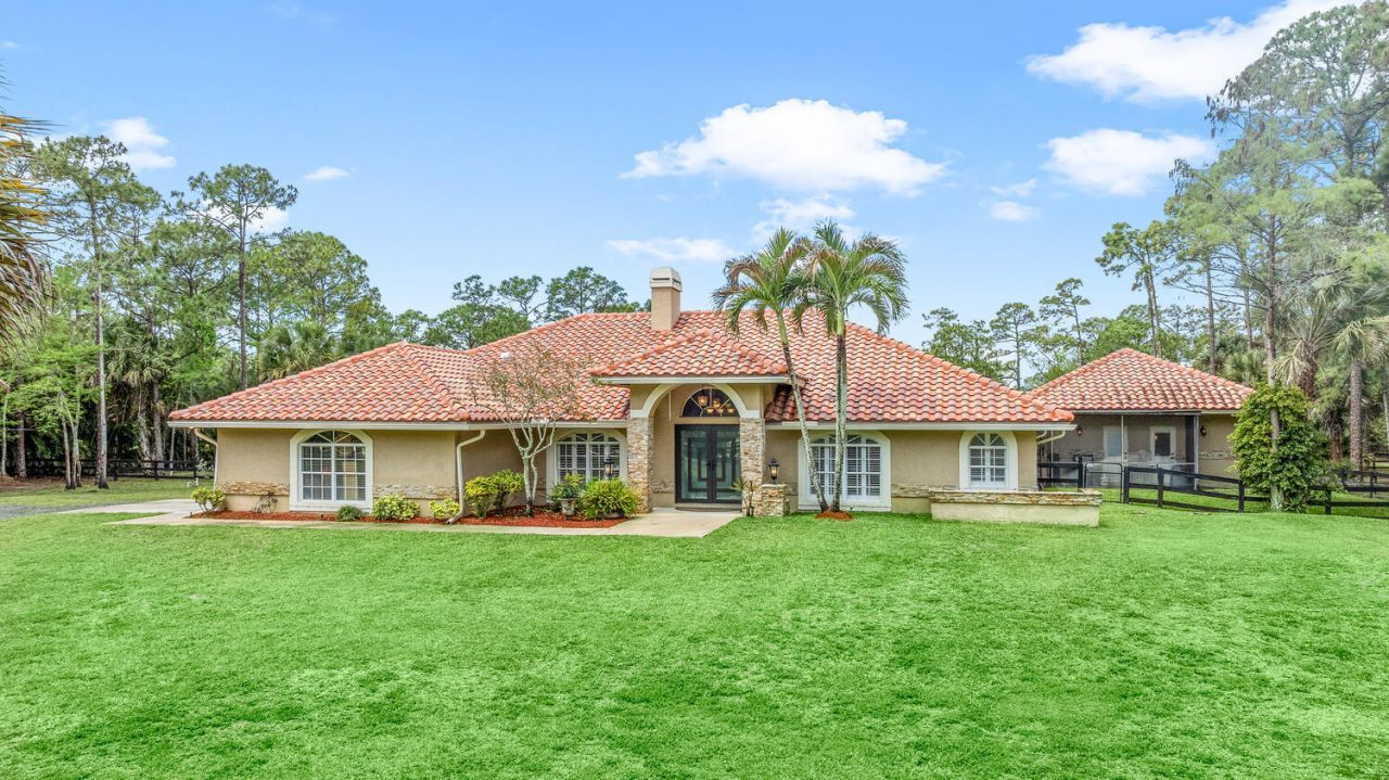 Nestled on 5 pristine, fully fenced acres in the exclusive gated equestrian community of Deer Run. This exceptional property offers the perfect blend of family living and premier equestrian amenities. The beautifully updated main residence features 3 bedrooms plus large office (can be 4 bedrooms), 2 bathrooms, and a 2+ car garage, showcasing new flooring, renovated bathrooms, and a spacious, open-concept layout. A large kitchen flows seamlessly into the expansive family room, complemented by a formal dining space ideal for entertaining. Step outside to an oversized screened patio overlooking a stunning pool with a waterfall feature and fire pits-creating a true private oasis. A fully equipped 1-bedroom, 1-bathroom guest house with full kitchen and impact glass provides the perfect space for visitors, staff, or rental income potential. This property has been thoughtfully upgraded for efficiency and peace of mind, including new hurricane impact double front doors, new house roof (2025), top of the line Bora Steel tile roof with cooling insulation and 225 wind mitigation, updated pool and irrigation pumps (2025), new AC (2025), and a whole-farm generator supported by two underground propane tanks (1,000 and 500 gallons). The home also features a top-of-the-line reverse osmosis water system and remarkably low monthly electric costs. Equestrians will appreciate the professionally designed 5-stall center aisle barn with an oversized 14-foot aisle. Barn features a tack and feed room with washer/dryer, fly spray system, fridge/freezer, easy fill water system for each stall, and stall runouts. Additional features include four covered tack-up areas, a CBS manure bin, storage shed with electric, and a resurfaced driveway (2025). A new wraparound deck (2024) overlooks the barn, perfect for relaxing or entertaining after a ride. Ideally located less than one mile from White Fences Equestrian Center, riders can easily access schooling and recognized shows year-round. Gate access at rear of property leads to miles of scenic trail! Located just 4 miles to local shopping, and only 13 miles from Wellington International and Global Dressage Festival. This is a rare opportunity to own a turnkey equestrian estate in one of South Florida's most desirable riding communities.