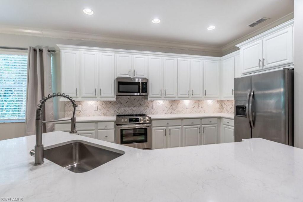 Spacious first floor coach home located in the Cassia neighborhood of Vasari, offering a comfortable open layout and a private wooded backdrop. This residence features 3 bedrooms, 2 baths, and approximately 2,034 sq. ft. of interior living space. The great room design provides a seamless flow between the living, dining, and kitchen areas. The kitchen has been updated with stainless steel appliances, white cabinetry, new plumbing fixtures and countertops. Island with breakfast bar area, pantry, and condo is equipped with dishwasher, refrigerator, microwave, stove, washer, dryer and utility tub. The primary suite includes dual walk in closets and an en suite bath with two vanities, a soaking tub and separate shower. A 2 car garage and screened patio enhance everyday convenience. Located in close proximity to community pool, mailboxes, and guest parking. Residents of this community enjoy access to amenities such as an 18-hole golf course, fitness center, tennis, bocce, and a community pool, along with beautifully maintained grounds and convenient proximity to Bonita Springs shopping, dining, and beaches.
