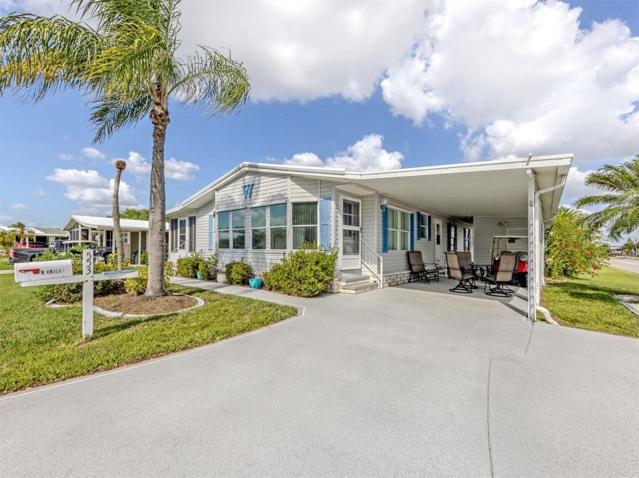 Welcome to easy Florida living in this well-maintained 1995, 2-bedroom, 2 bath manufactured home, ideally situated on a desirable corner lot in the highly sought-after, land-owned, pet friendly community of Harbor Isles. Perfectly positioned directly across from the marina, this home offers both a prime location and a relaxed coastal lifestyle. Step inside to discover a bright and spacious floor plan featuring vaulted ceilings throughout and 1,280 square feet of comfortable living space. The large kitchen is a true centerpiece, offering abundant cabinetry and counter space, all open to the expansive dining and living areas-perfect for entertaining or everyday living. Just off the living room, a beautiful Florida room spans the entire length of the home and is equipped with acrylic windows, luxury vinyl flooring, and its own AC, creating a versatile space to enjoy year-round.Both bedrooms are generously sized and feature large walk-in closets, while the two spacious bathrooms include skylights that fill the spaces with natural light along with ample storage. Additional highlights include a 2022 AC system, a large shed with newer washer and dryer, two workbenches for hobbies or projects, and a golf cart that is included with the home. Being offered turnkey furnished, you can move right in and start enjoying the Florida lifestyle immediately. Harbor Isles is a vibrant, amenity-rich waterfront community offering a marina with direct access to the Intracoastal Waterway and Gulf of Mexico, a large clubhouse, heated pool and spa, fitness center, tennis and pickleball courts, bocce, shuffleboard, and a full calendar of social activities. This active and friendly community is conveniently located near shopping, dining, beautiful Gulf beaches, and historic downtown Venice. This is your opportunity to own a piece of paradise in one of the area's most desirable communities.