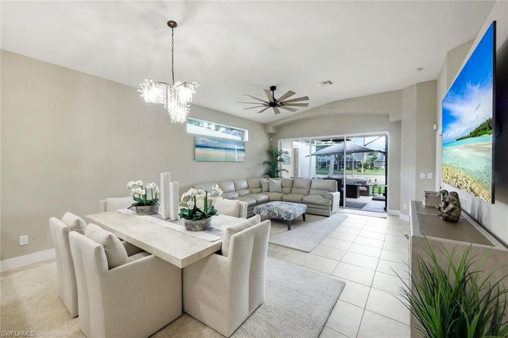 This beautifully updated single-family home offers peaceful water views, modern improvements and the privacy that comes with a detached residence in a gated community. Situated on high elevation in the preferred X-zone, this home has approximately 1,600 square feet of living space, 3 bedrooms, 2 bathrooms, and a 2-car garage, delivering an ideal balance of comfort, functionality, and low-maintenance living in a highly desirable North Naples location. The thoughtfully designed floor plan showcases vaulted ceilings and an open-concept main living area filled with natural light, creating an inviting atmosphere well suited for both everyday living and entertaining. The kitchen has been enhanced with brand-new LG appliances offering both style and performance, while updated lighting and fixtures throughout the home contribute to a clean, contemporary feel. The primary suite provides a relaxing retreat overlooking the tranquil water view and features a renovated bathroom with quality finishes and attention to detail. A second renovated bathroom enhances comfort for guests and family, while two additional bedrooms provide flexibility for a home office, den, or guest accommodations. Recent upgrades provide exceptional peace of mind, including a new roof installed in 2023, a Lennox air conditioning system added in 2024, electric storm shutters on both the front door and rear doors of the home, plus an Anderson storm door for added protection. Interior improvements include new laminate flooring in the bedrooms, fresh paint, upgraded 5-inch base molding, plantation shutters, and electric silhouette shades in the living room. The laundry area features a new LG washer and dryer and the garage has been enhanced with a mini-split air conditioning system, built-in Kobalt storage cabinets, and a garage door opener with battery backup and remote access capability. Outdoor living is equally appealing, with a screened lanai that overlooks the peaceful water view and provides a comfortable space to relax or entertain. Additional enhancements such as new landscaping with stone accents and outdoor lanai shades. Residents of Ibis Cove enjoy low HOA fees that include cable and internet, along with access to resort-style amenities including a heated pool and spa, fitness center, tennis/pickleball courts, playground and scenic walking paths. Conveniently located near shopping, dining, entertainment, and the renowned white-sand beaches of Southwest Florida, this move-in ready single-family home with water views in the X-zone presents an outstanding opportunity to enjoy the best of North Naples living.